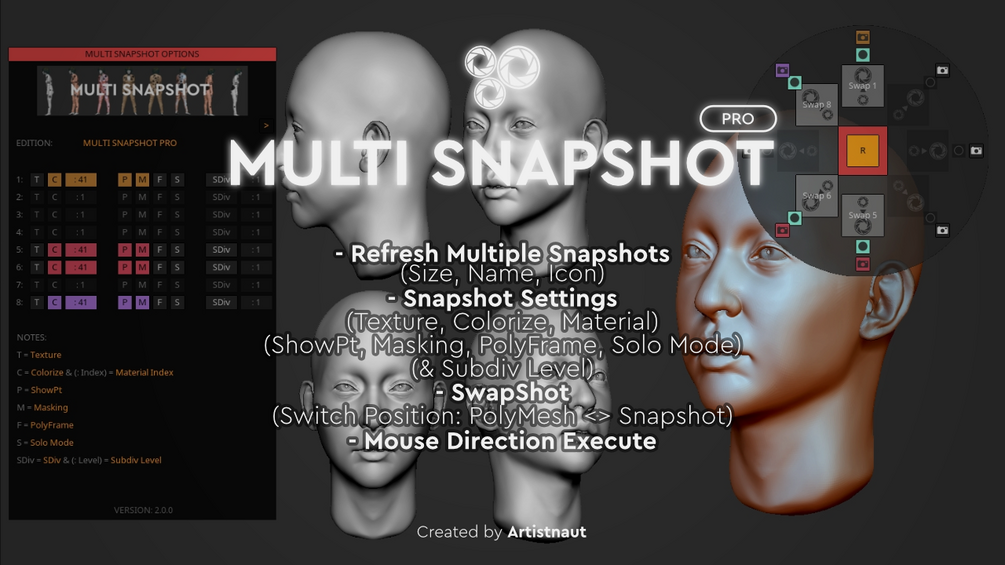 This plug-in Multi Snapshot is an extension module for the Personalizer plug-in for ZBrush 2022 or later.