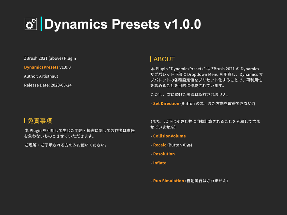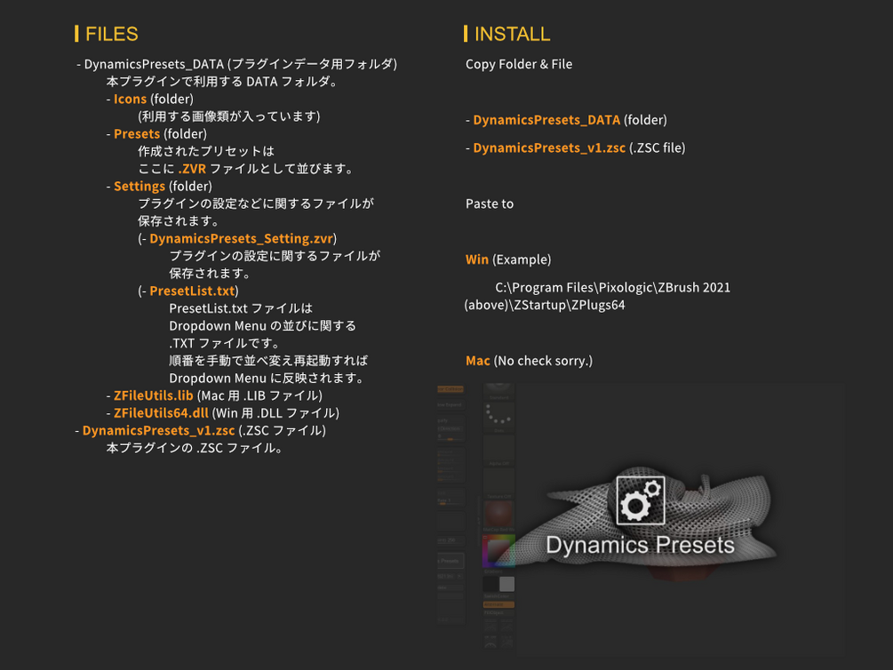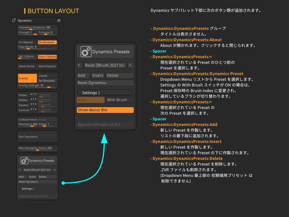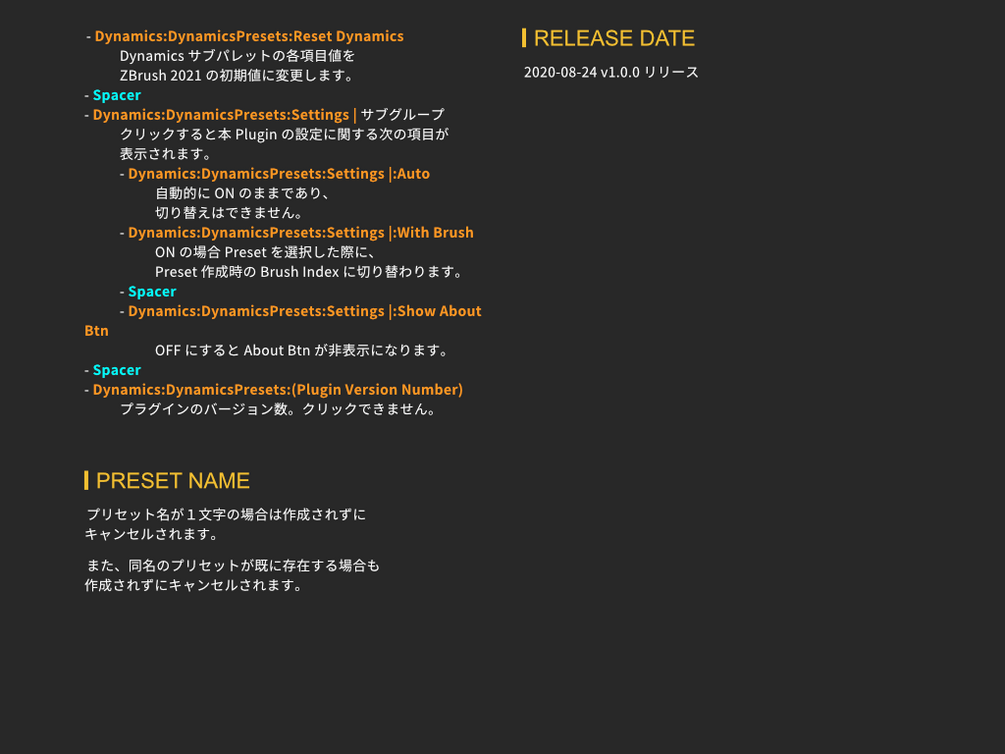 本 Plugin "DynamicsPresets" は ZBrush 2021 の Dynamics サブパレット下部に Dropdown Menu を用意し、Dynamics サブパレットの各種設定値をプリセット化することで、再利用性を高めることを目的に作成されています。
